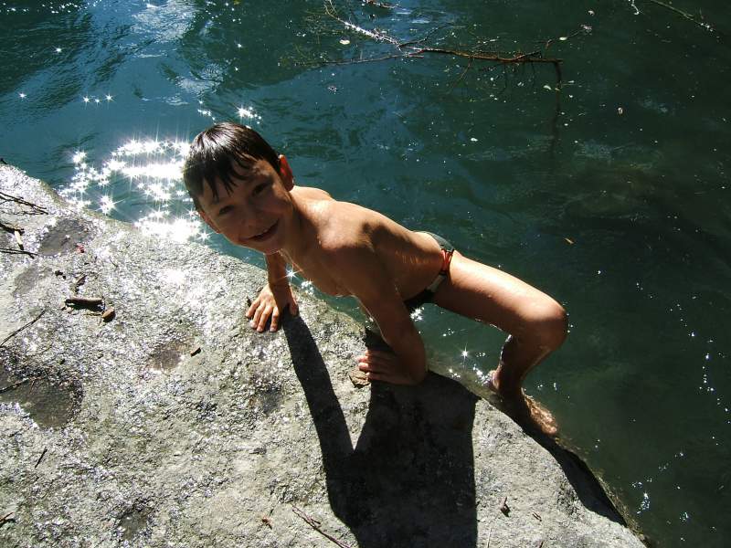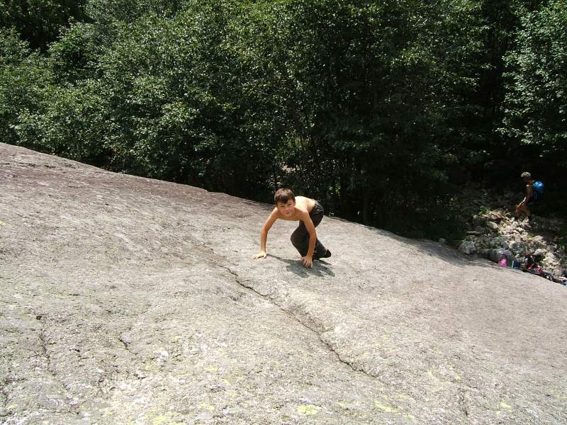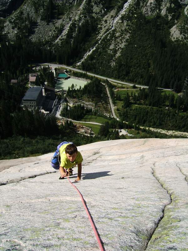 ![]() Dann sind wir zusammen für 6 Tage zum Klettern, Bouldern und baden im Val di Mello und im Handegg, wo Karl Richard seine ersten Granitplatten klettert und das selbst Legen der Sicherungspunkte kennenlernt. Wir klettern Routen mit Längen bis zu 4 Seillängen - richtiges Bergsteigen! | ![]() | ![]() |