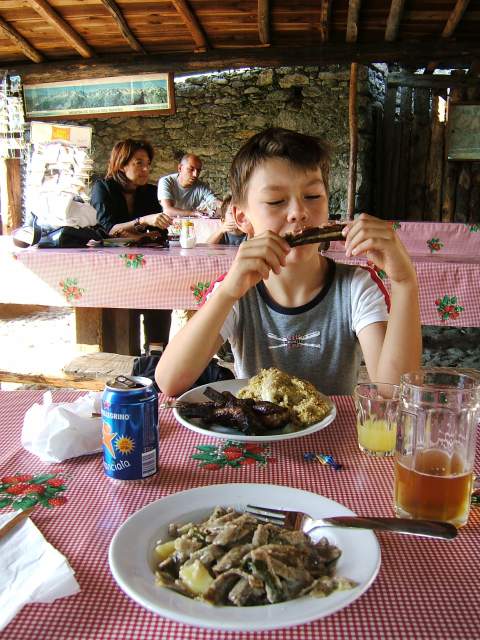 ![]() | Das Essen im Rifugio "Luna Nascente" direkt unter dem bekannten gleichnamigen Kletterweg ist rustikal, original und genau das richtige für uns nach der sportlichen Betätigung im Granit |