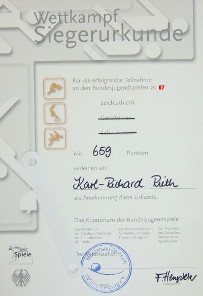 kurz vor den Sommerferien sind für Karl Richrd und seine Mitschüler wie jedes Jahr auch wieder die Bundesjugenspiele. Wieder haben wir im Geheimen trainiert, sind jeden Tag 30 min. gelaufen. Und so kommt es wiederum zu einer Steigerung bei der Punktezahl und zur Siegerurkunde 2007 | |