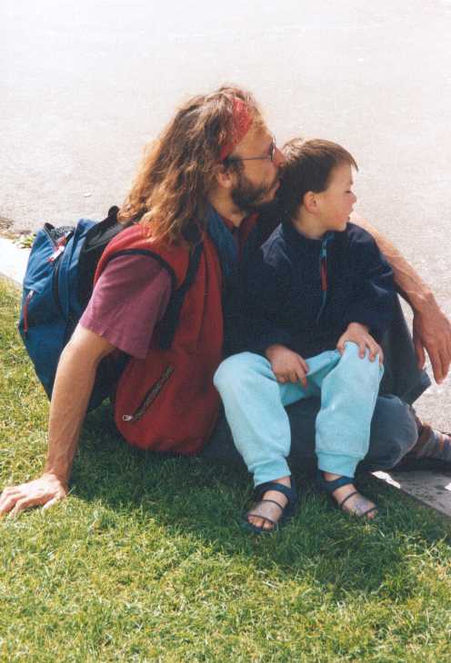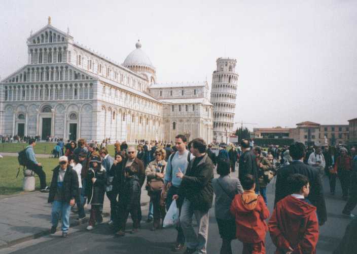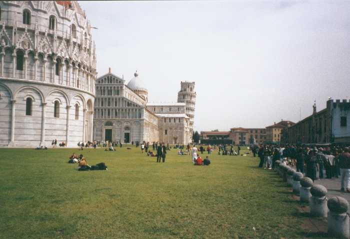 Auf dem großen Platz von Pisa bewundern KR und Papa gemeinsam den "krummen" Turm und die anderen Bauten. Aber nicht allein, die Mama ist auch dabei und tausend andere Leute von überallher.
